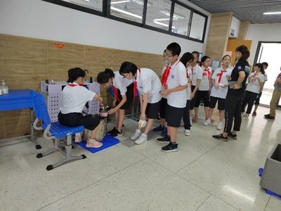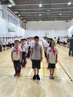 上午,大队部的志愿者们带领新生熟悉校园。体育老师们顶着烈日对各班进行队列训练、广播操教学及进退场练习。同学们集合有序,到位迅速。