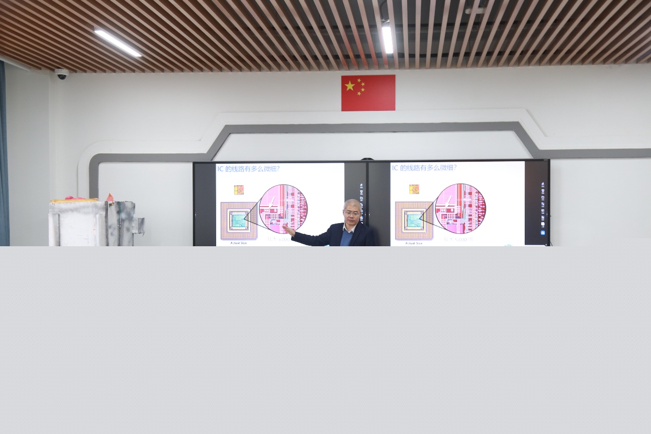 签约仪式结束后,蒋玉龙教授为复旦二附?!按葱尽鄙缤叛г笨驳谝豢巍K钊肭吵龅亟步饬思傻缏酚肴斯ぶ悄芰煊虻那把丶际鹾头⒄骨魇?,带领孩子初步认识集成电路,走进“芯”时代,激发了同学们对前沿科学领域的兴趣。