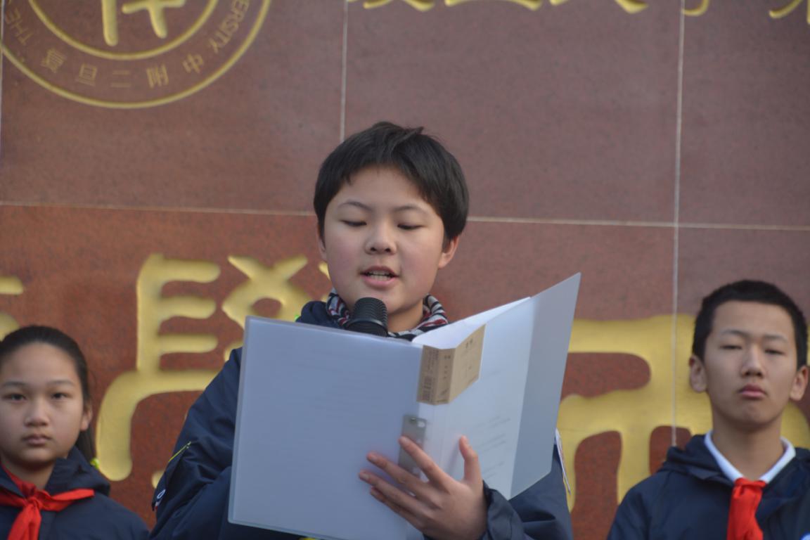 本次国旗下讲话的主题是“我与二附校共成长”,由初一五班靳启远、施蔡丽泰、王澈、王晨阳同学和 科学教研组长洪俊老师带来演讲。全体跨立。