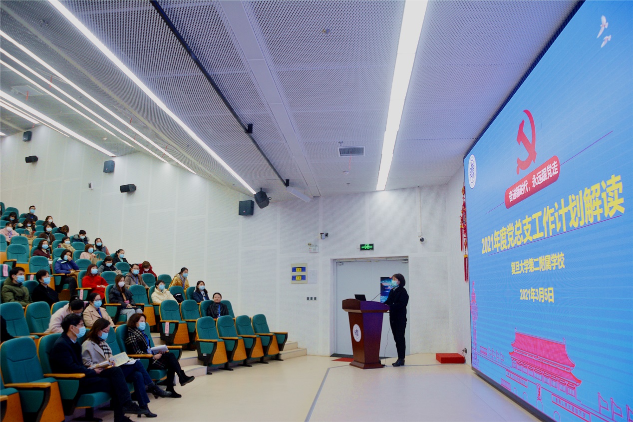 2021年3月5日下午,复旦大学第二附属学校党总支在新江湾校区步德楼阶梯教室召开新学期全体党员大会,会议由瞿丽红书记主持。