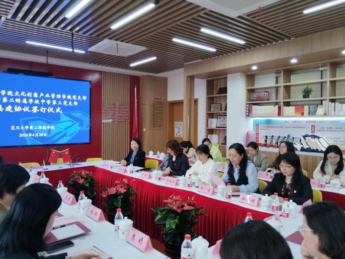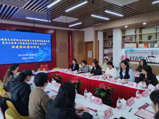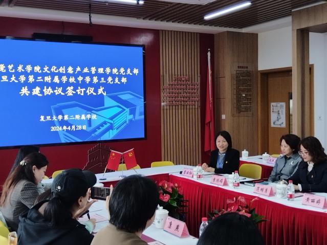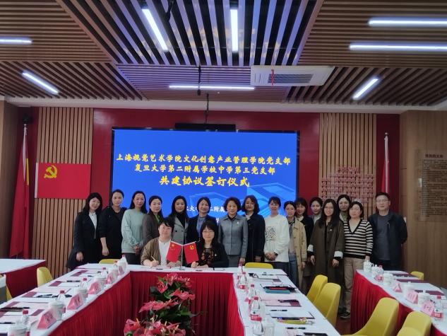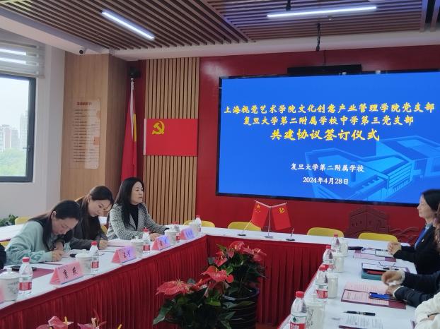 为深入贯彻落实习近平新时代中国特色社会主义思想,推动党建工作与学校教育教学的深度融合。4月28日下午,上海视觉艺术学院文化创意产业管理学院党支部与复旦大学第二附属学校中学第三党支部举行共建签订仪式。上海视觉艺术学院副校长唐竭婧等一行6人,二附校党总支书记瞿丽红、校长李鸿娟、中学三支部党员一同参加了共建会议。