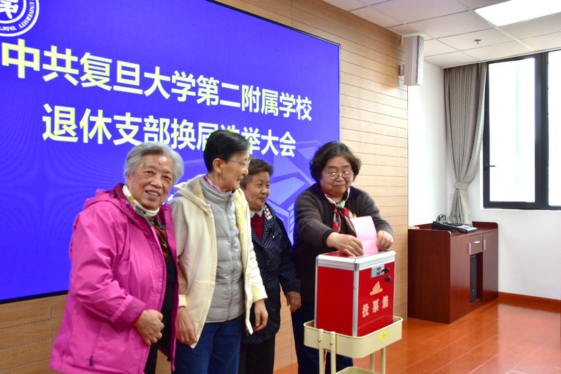 2021年4月7日上午,复旦二附校退休党支部换届选举大会在新江湾校区举行,退休党支部全体成员与会,复二附校党总支书记瞿丽红、校长李鸿娟和总支委员、副校长陈金辉、总支委员丁蕾出席大会,中学退休党支部书记胡爱珠主持会议。