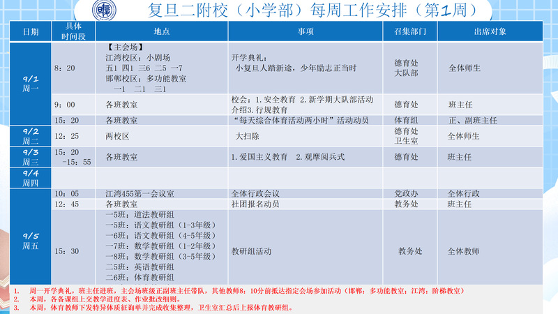 2025学年第一学期复旦二附校(小学部)第1周工作安排
