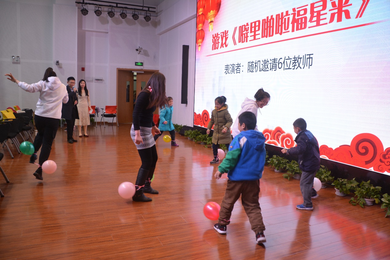 游戏环节,“噼里啪啦福星来”成了孩子们的欢乐场。三位勇敢的老师成了“丰年留客足鸡豚”的大花猫,引得全场阵阵笑声。