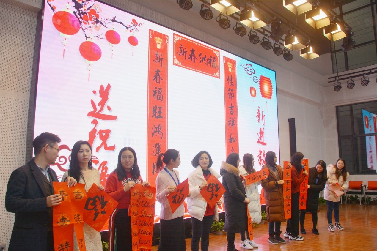 “迎新”---迎新年,迎新校区,迎新进教师。最后,当然是二附校新鲜血液的集体亮相---新人写对联送祝福。他们是朝气,是活力,是创造,是未来。这次联欢会也是由这些新进教师团体倾情筹备,诚信之作。二附校是拧成一股绳的大家庭,老中青三代都在为这个家庭谋发展谋幸福,责无旁贷。