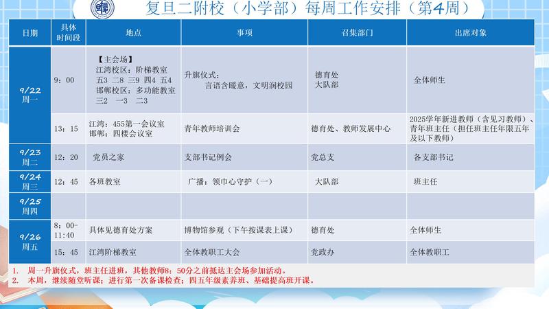 2025学年第一学期复旦二附校(小学部)第4周工作安排