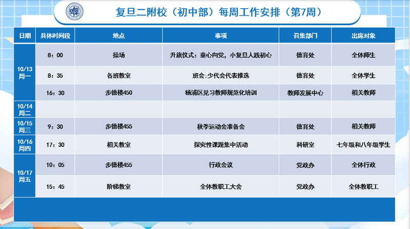 2025学年第一学期复旦二附校(中学部)第7周工作安排