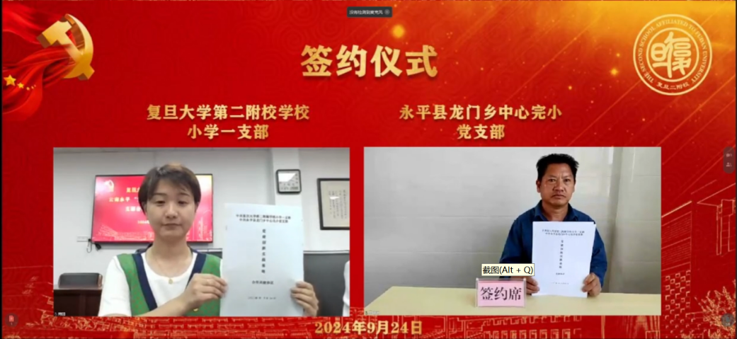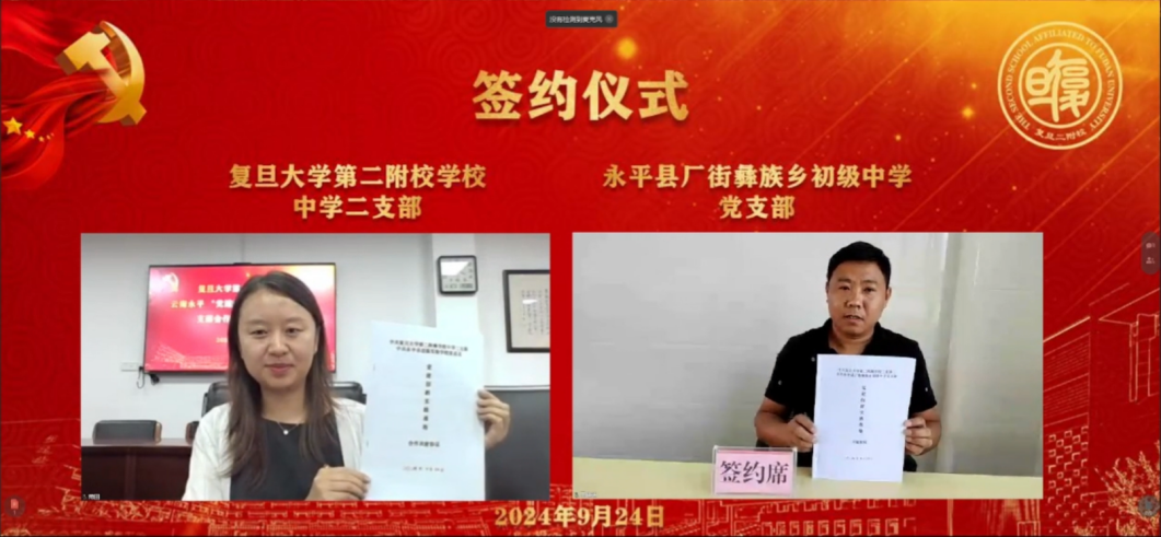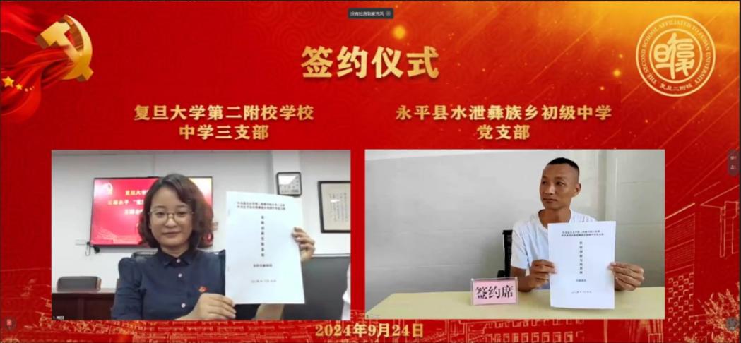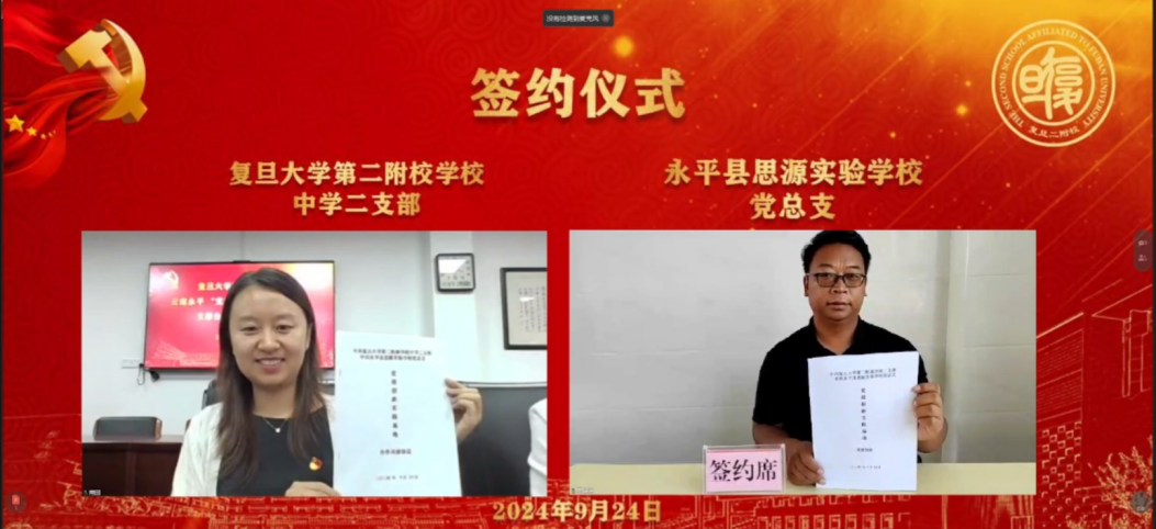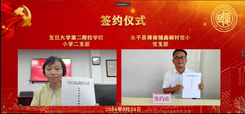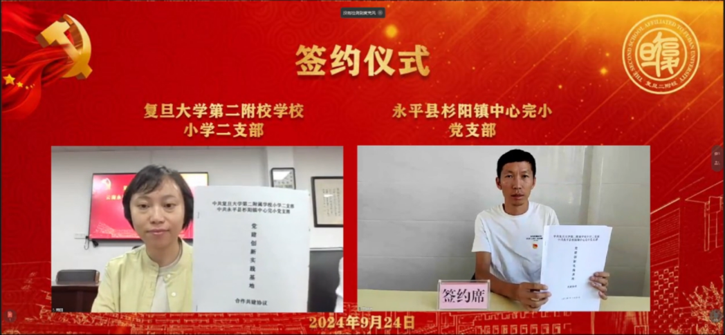 复旦大学第二附属学校在职党支部与永平县“党建创新实践基地”学校党支部在线签订共建协议(名单附后)。