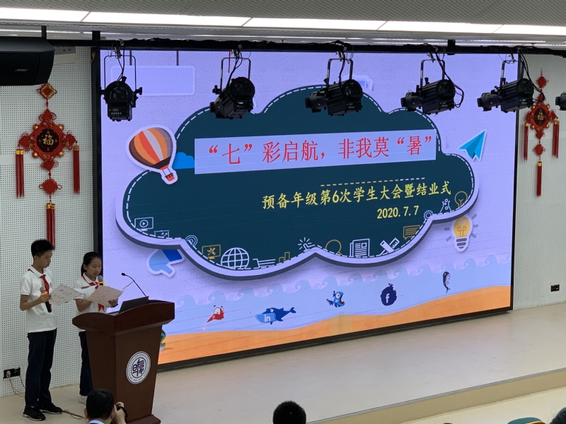 7月7日,在新江湾城派出所的警察叔叔为全校师生进行安全教育之后,2023届预备年级学生举行了主题为《“七”彩启航,非我莫“暑”》预备年级第六次学生大会暨结业式。