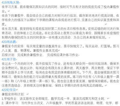 其次,同学们对已经过半的暑假生活进行了个人小结,并表示会根据作业的完成情况调整暑期后半段的学习计划,在班内营造了一种积极向上、你追我赶的学习氛围。