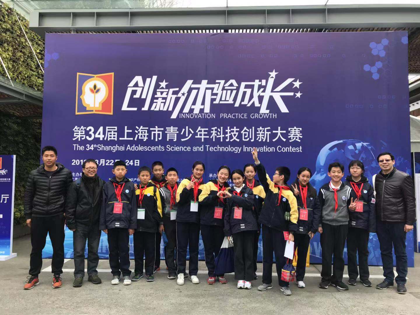 “探究中成长”:获第34届上海市青少年科技创新大赛一等奖的课题组同学和老师合影