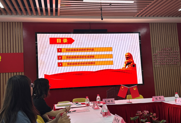 党支部书记范明月为大家作了《以自我革命精神全面推进从严治党》的专题党课。她从甲骨文、金文等不同的字体讲起,分析了“革命”的内涵,系统而又生动地讲解了党的自我革命的科学内涵、生成逻辑和实践路径。