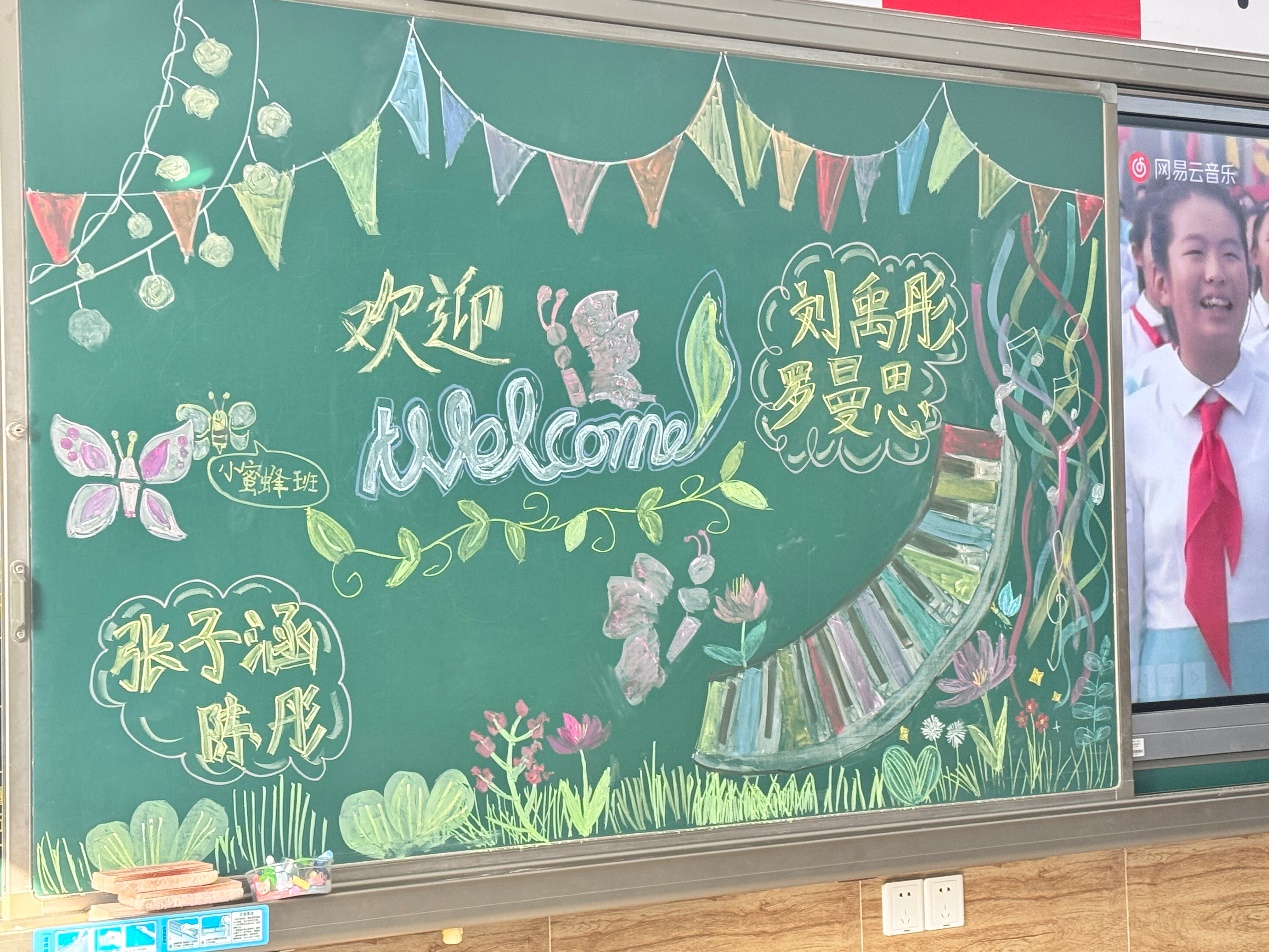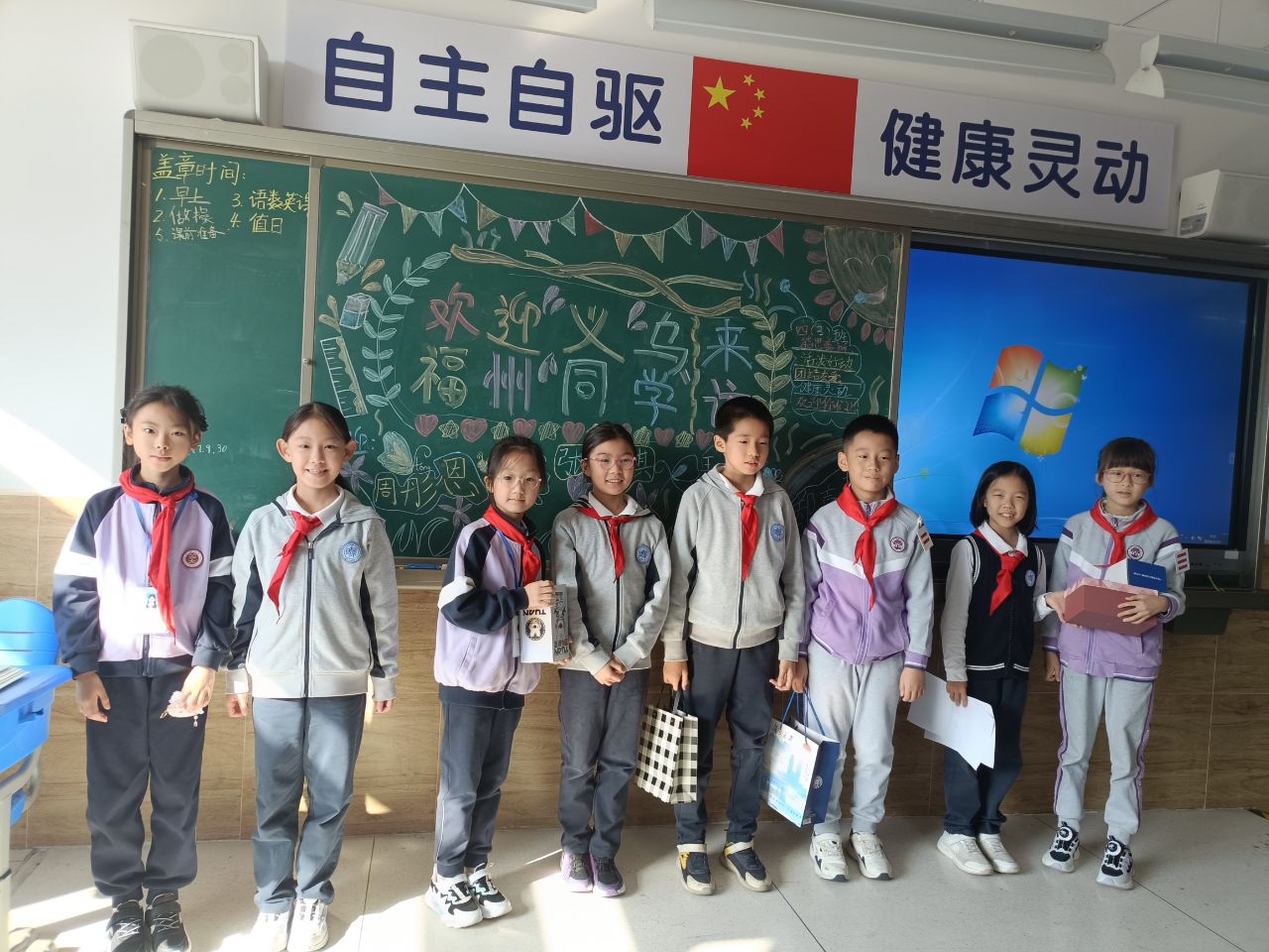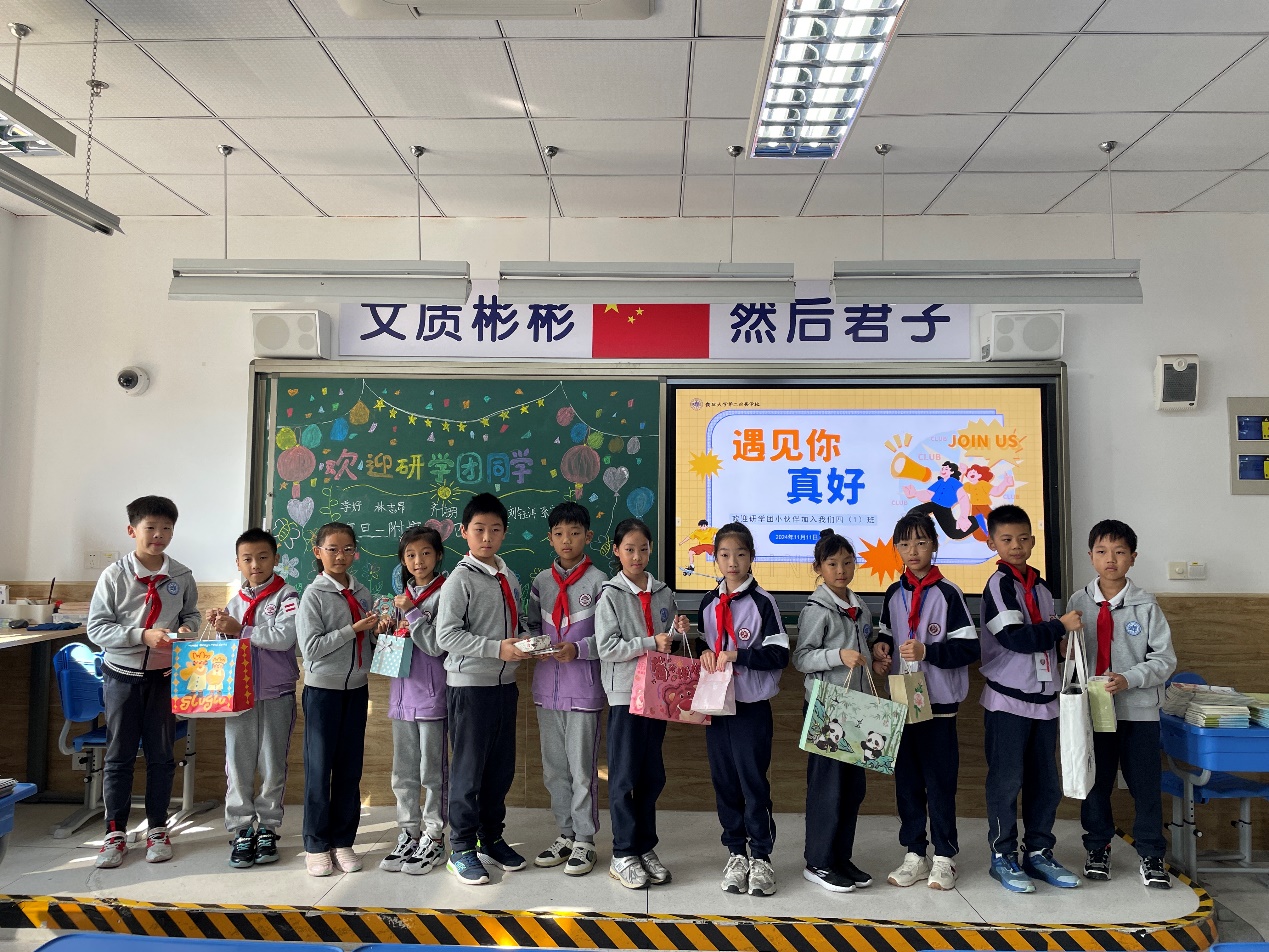 在结对伙伴的带领下,来访学生进入四、五、六年级各班级,参加各具特色的班级欢迎仪式。手绘的欢迎板报,特色校园文化介绍,有趣的互动表演,精心准备的小礼物等,无不彰显出二附校师生对来访伙伴的热情,对研学交流的期待。