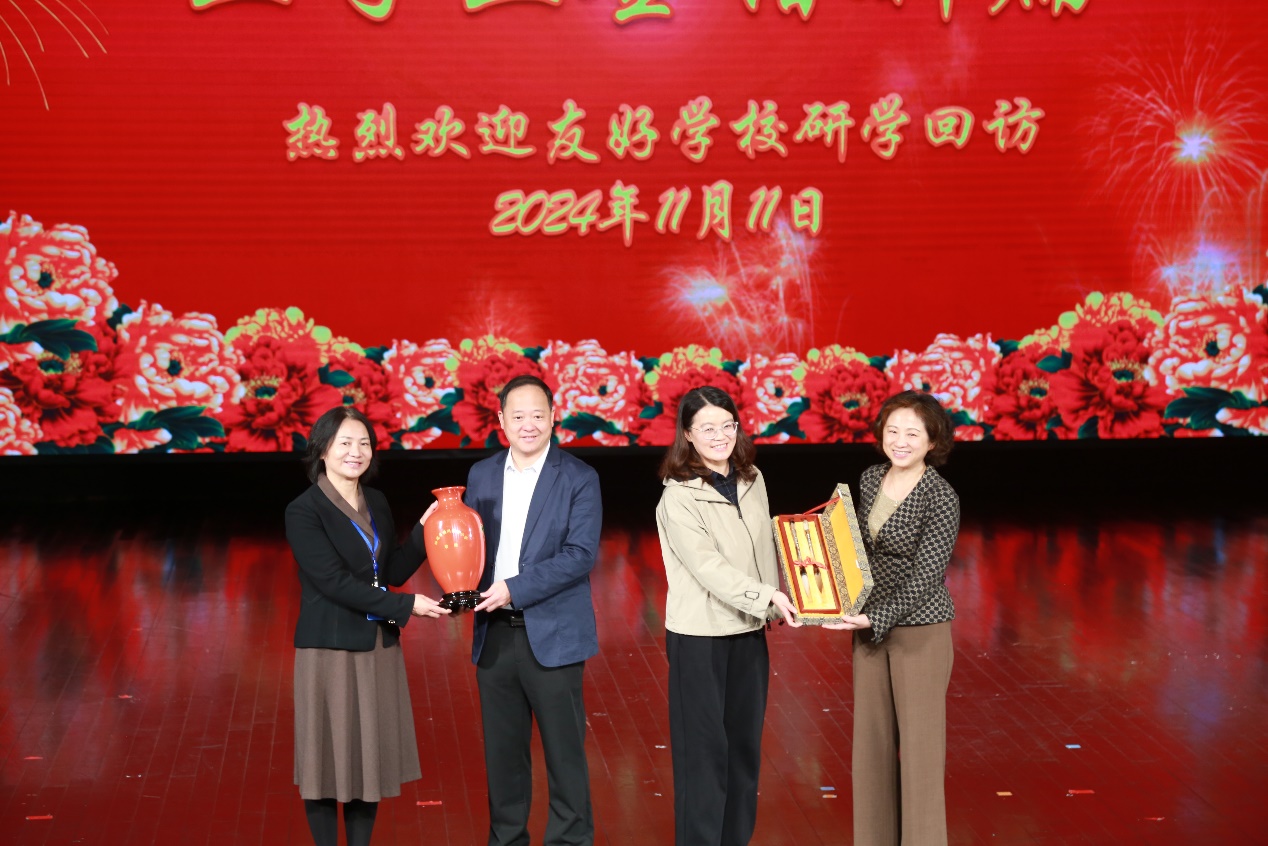 李鸿娟校长、瞿丽红书记代表学校接受来访团的赠礼。