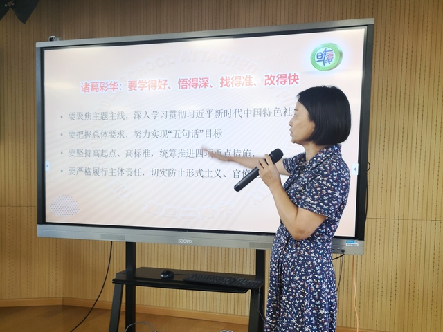 接着围绕总体思路、学习目标和主要学习内容,瞿书记结合复旦二附校转型发展的新挑战和新机遇,提出了学?!安煌跣模渭鞘姑敝魈饨逃乃伎?。明确了“面向教育现代化,我们的使命担当”的主要学习目标,以“构建学校全员、全程、全方位”育人体系党建研究课题为载体抓实师德师风建设,落实大中小一体化德育课程建设。结合教育实践,采取形式多样的学习方式,确保学习教育活动的实效。