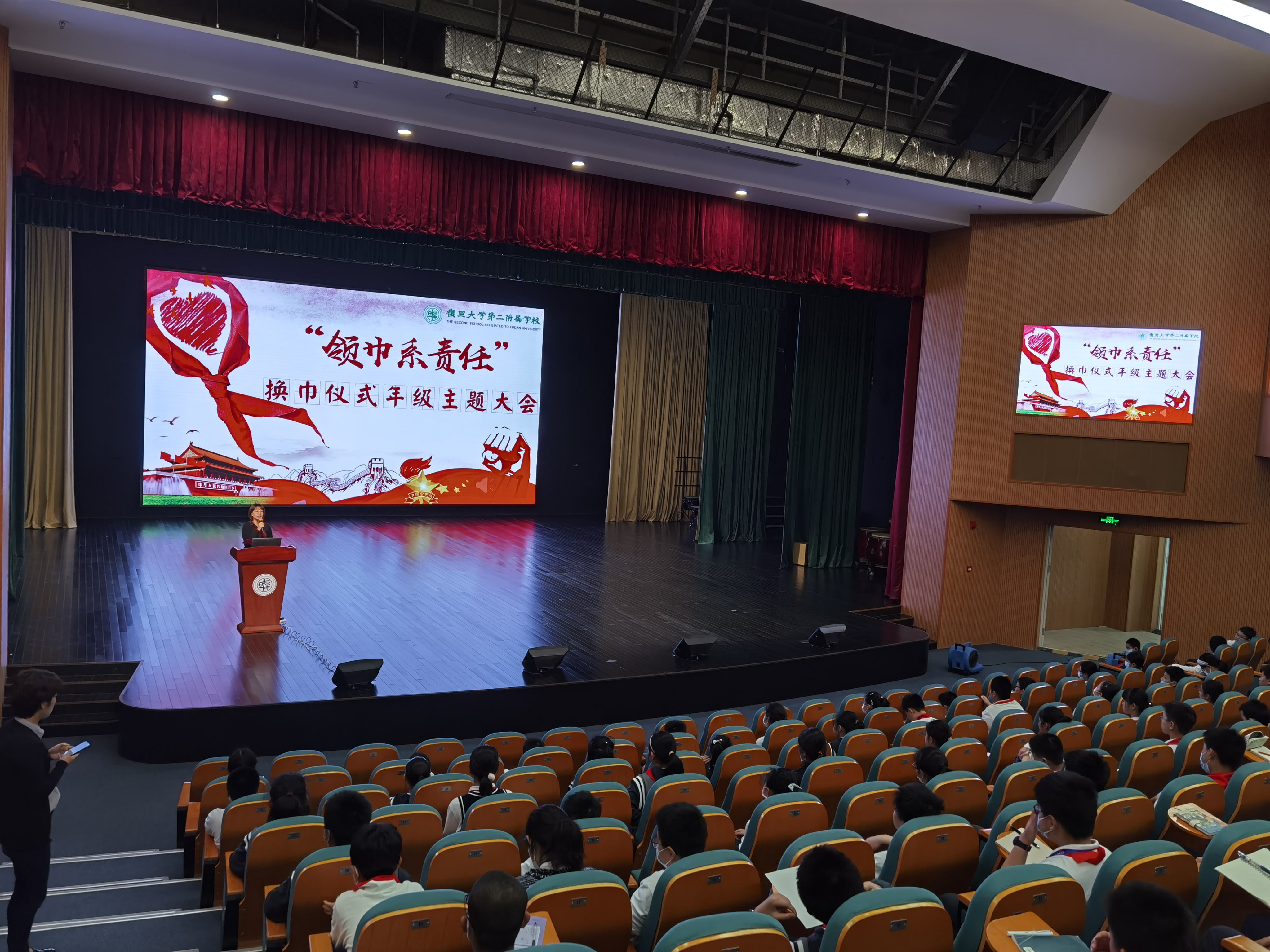2020年10月27日下午三点半,复旦二校预备年级召开了关于换戴大号红领巾的年级主题大会。本次活动由预备(1)、(2)班主持。