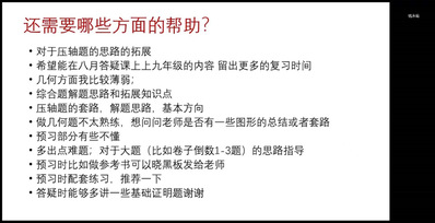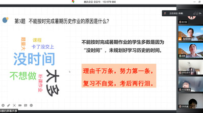 随后,任课老师们总结了七月份答疑情况,提醒同学们激发学习主动性,提高学习效率,有的放矢。此外,老师们通过暑假作业问卷分析,提醒同学们关注各个学科的作业完成情况,要利用暑假时间开始适应初三明显加快的学习节奏,为迎接中考做准备。班主任强调暑期学习要“持之以恒,不乱节奏”,告诉同学们在暑期生活中要回味到其中的“有趣”。