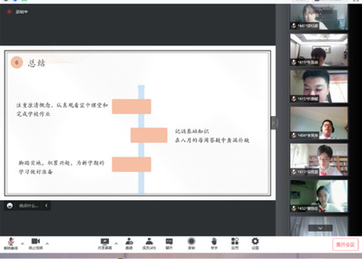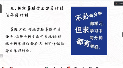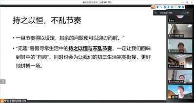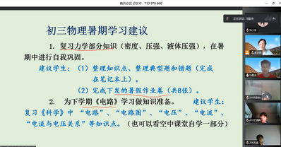 班主任王老师回顾了初二学习生活,表达了对同学们假期及网课生活的感慨和对同学们未来学习的期待。随后,任课老师开始了暑期的学习建议。
