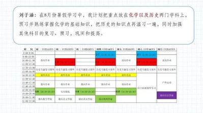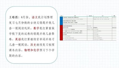 第二个环节是由各战队代表交流七月学习情况的反思和八月的学习计划。林珑同学从学习和生活两个角度全面分享了七月的暑假生活;张浩然同学分学科制定了详细的八月学习计划;张鸿远介绍同伴暑期生活,也表达了自己的深度思考;荆浩然同学一一列举了八月份要完成的学科拓展任务;周关珺同学在七月学习中不断调整优化暑假计划;史韵扬同学制定了每天的学习活动计划表,方便进行时间调配。