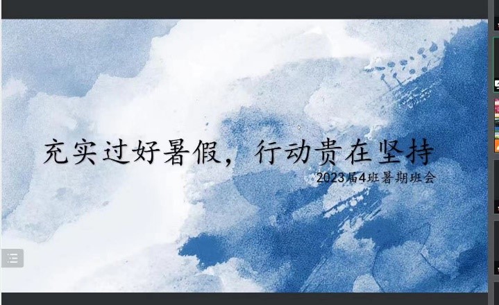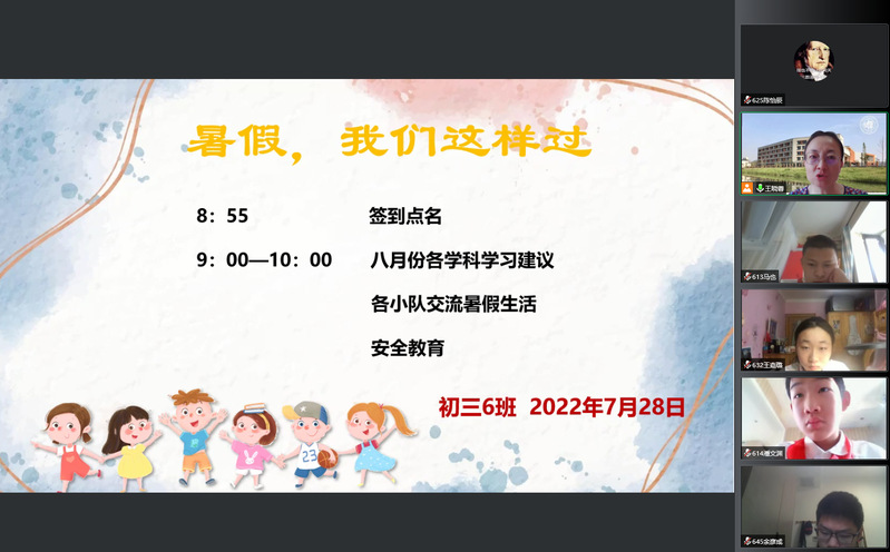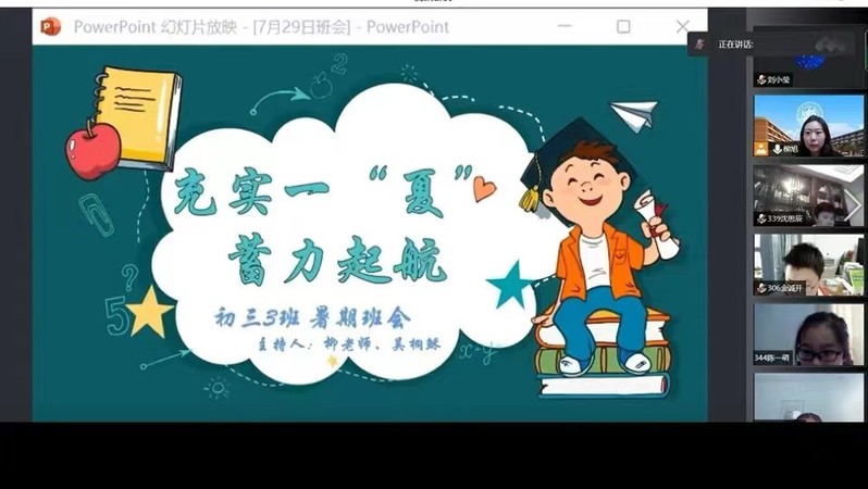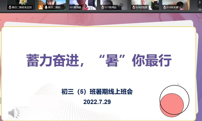 绿树阴浓、蝉鸣伴风的暑期,2023届学子们拉开了奔赴中考的大幕。为帮助同学们更好地把握自己的航向,2022年7月28日至7月30日,复旦二附校九年级各班陆续召开主题班会。师生齐聚云端,总结学习生活,明确学习方向,分享缤纷假期,就让我们一览各班的精彩班会吧!