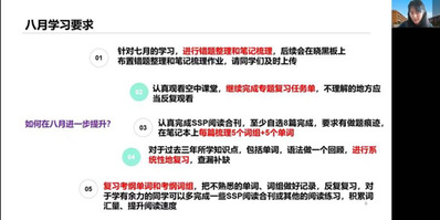 接下来是任课老师讲解学科要求及建议。数学郑老师提出了作业上交和课程自学的要求,并且用便于记忆的口诀来鼓励同学坚持学习。英语王老师建议同学们在课内学习的基础上,注重课外拓展,同时明确了八月的学习要求。历史章老师反馈了七月份同学们的学习情况,勉励同学们努力为历史中考做好准备。物理洪老师和化学袁老师解答了同学们对于学科学习的困惑,讲解了学科考试范围。语文柳老师反馈了学习现状,并特别强调了“综合运用”该如何准备。老师们的精心讲解,为满腔热血的同学们指明了一条切实可行的学习道路。