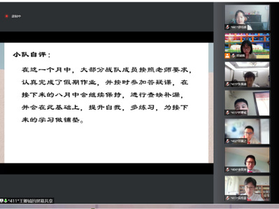 最后一个环节是各战队分享暑假学习生活情况。这一环节分别由潘卓林、戴昕羽、王则涵、洪悦茗、周关珺、方言同学分享。同学们暑假生活丰富多彩,除了学习,还做了力所能及的家务,外出旅游。除了暑期指定的战队活动外,潘卓林战队还建立了钉钉战队学习圈,同学们互相分享每日的学习进度和成果,促进了队员之间的交流互助,充实了大家的生活。各战队也为同学们提出了几点学习上的建议,希望大家能共同努力,一起进步。