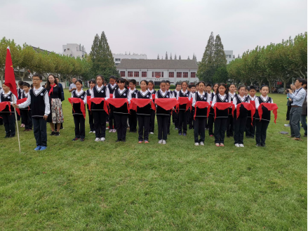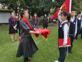 12点30分,换巾仪式正式开始。伴随着激昂的进行曲,出少先队队旗,全体队员敬礼,行注目礼。队员们高唱少先队队歌。