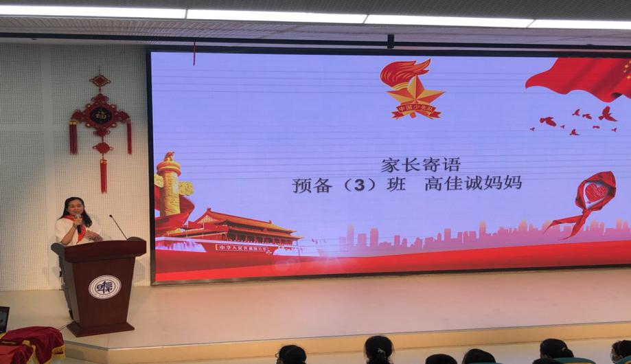 面对同学们成长道路上的新起点新征程,学生家长代表上台发言,对六年级全体队员表示了热烈的祝贺,祝贺队员们在人生的道路上又迈出了关键的一步,勉励他们继续努力,更加自立自强。