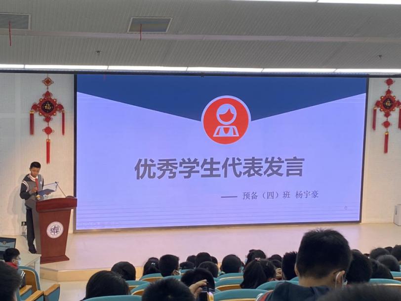 预备四班的杨宇豪同学作为优秀学生代表发言,他向我们分享他的学习经验,告诉我们要合理利用时间,认真做好各科复习、预习,充分利用碎片时间学习,以自身经历激励我们用辛勤的付出换取丰厚的回报。